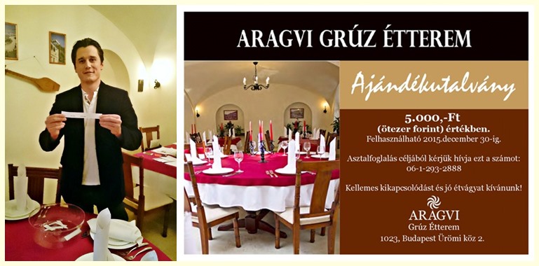 Az Étterem Hét látogatói között naponta 1-1 db ARAGVI ajándékutalványt sorsolunk ki 5 000,- Ft értékben! Gyere el hozzánk, és egyél egy finomat! Amennyiben te leszel Fortuna egyik kegyeltje, akkor a legközelebbi látogatásod alkalmával, már fel is használhatod az általad nyert ajándékutalványt!