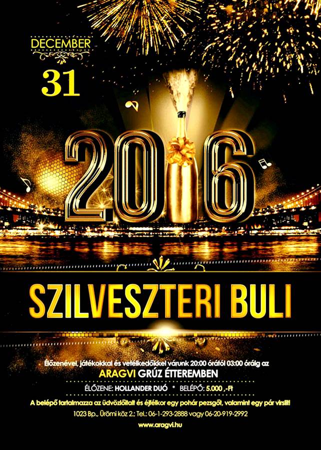 Már készülünk a szilveszteri bulira az Aragviban! Élőzenés esti mulatsággal, valamint szórakoztató játékokkal, vetélkedőkkel várunk Benneteket. Jegyek már elővételben 5.000,- Ft-ért, korlátozott számban kaphatók. A belépő tartalmazza az üdvözlőitalt és éjfélkor egy pohár pezsgőt, valamint egy pár virslit! Az élőzenét és a jó hangulatot a Hollander Duó biztosítja. Várunk benneteket szeretettel!